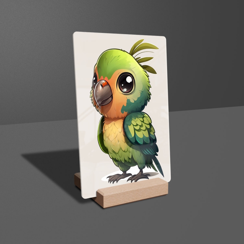 Na produktovém fotu vyobrazena nejoblíbenější varianta akrylového skla 14x21/21x14cm a dřevěný stojánek 10x10cm.