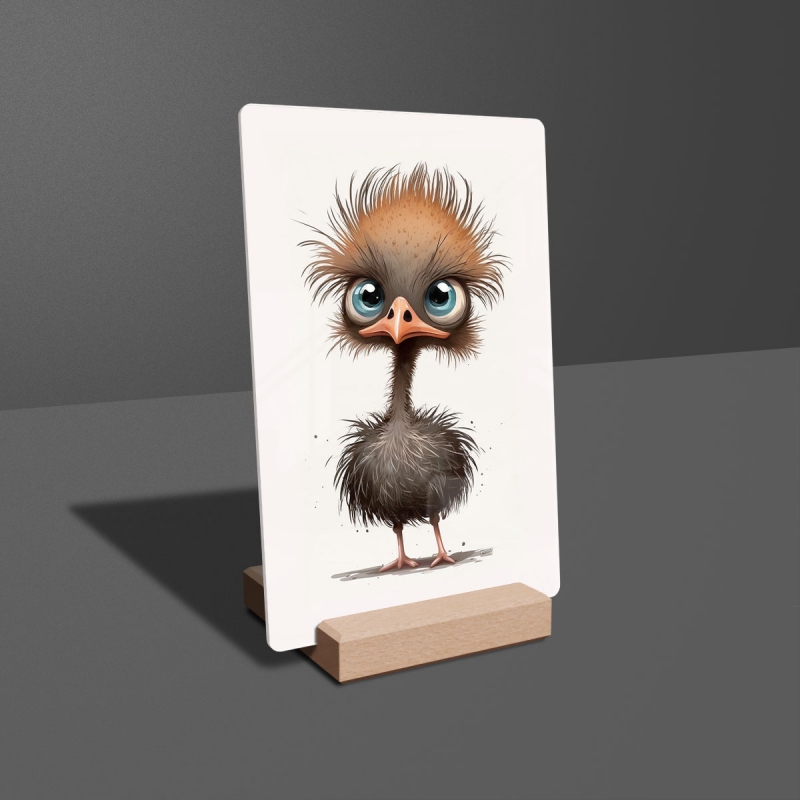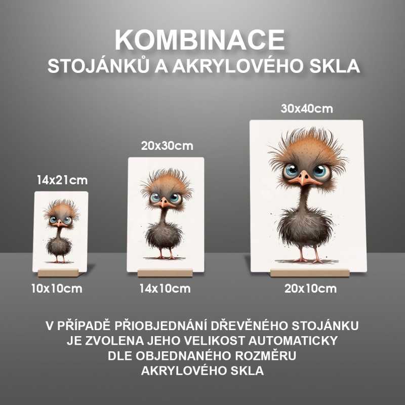 Na produktovém fotu vyobrazena nejoblíbenější varianta akrylového skla 14x21/21x14cm a dřevěný stojánek 10x10cm.