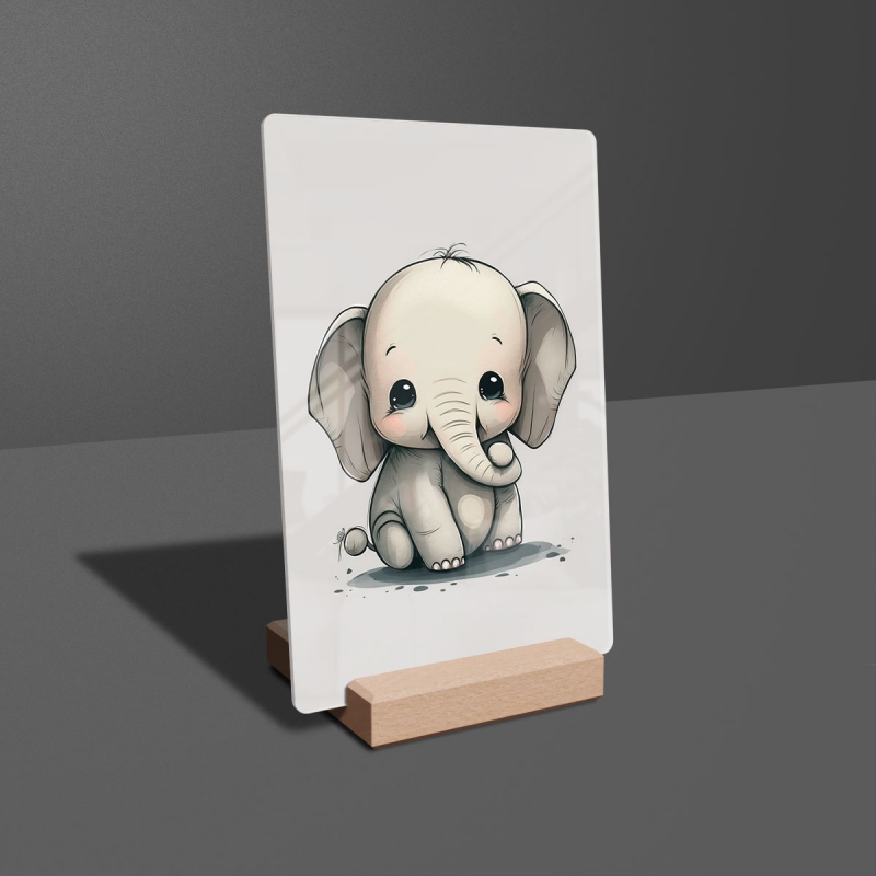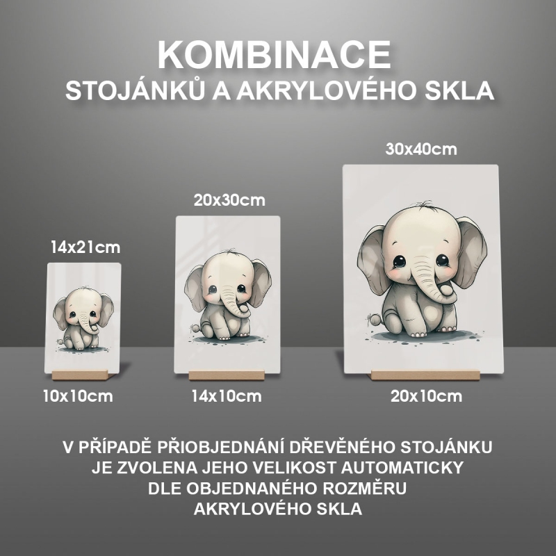 Na produktovém fotu vyobrazena nejoblíbenější varianta akrylového skla 14x21/21x14cm a dřevěný stojánek 10x10cm.