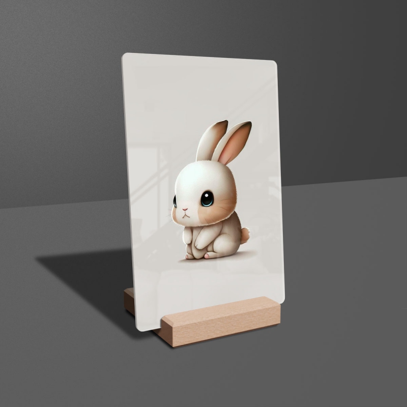 Na produktovém fotu vyobrazena nejoblíbenější varianta akrylového skla 14x21/21x14cm a dřevěný stojánek 10x10cm.