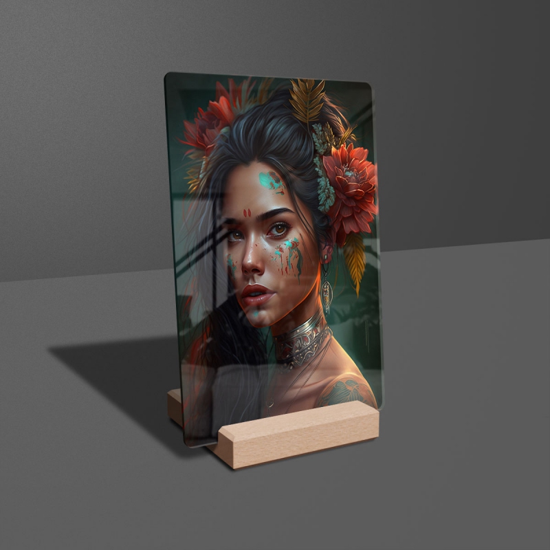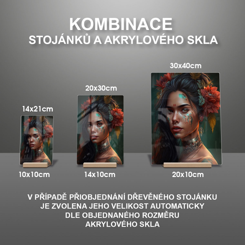 Na produktovém fotu vyobrazena nejoblíbenější varianta akrylového skla 14x21/21x14cm a dřevěný stojánek 10x10cm.