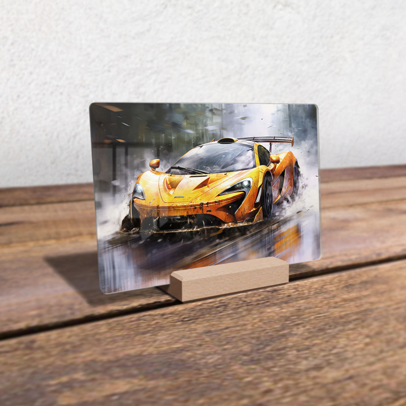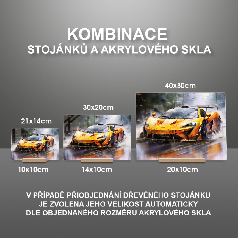 Na produktovém fotu vyobrazena nejoblíbenější varianta akrylového skla 14x21/21x14cm a dřevěný stojánek 10x10cm.