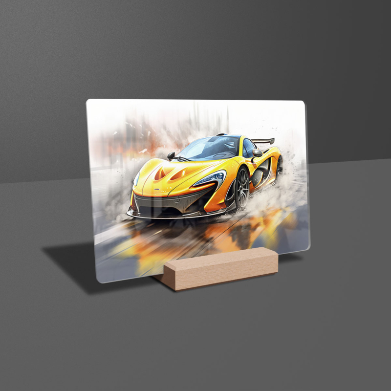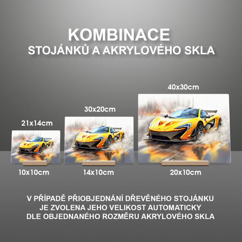 Na produktovém fotu vyobrazena nejoblíbenější varianta akrylového skla 14x21/21x14cm a dřevěný stojánek 10x10cm.