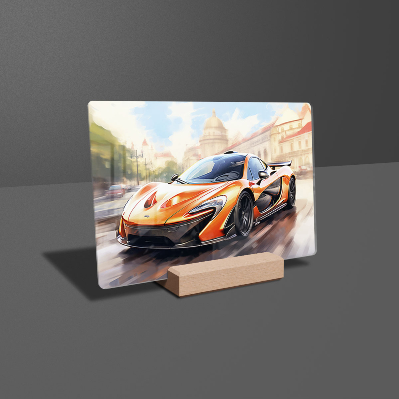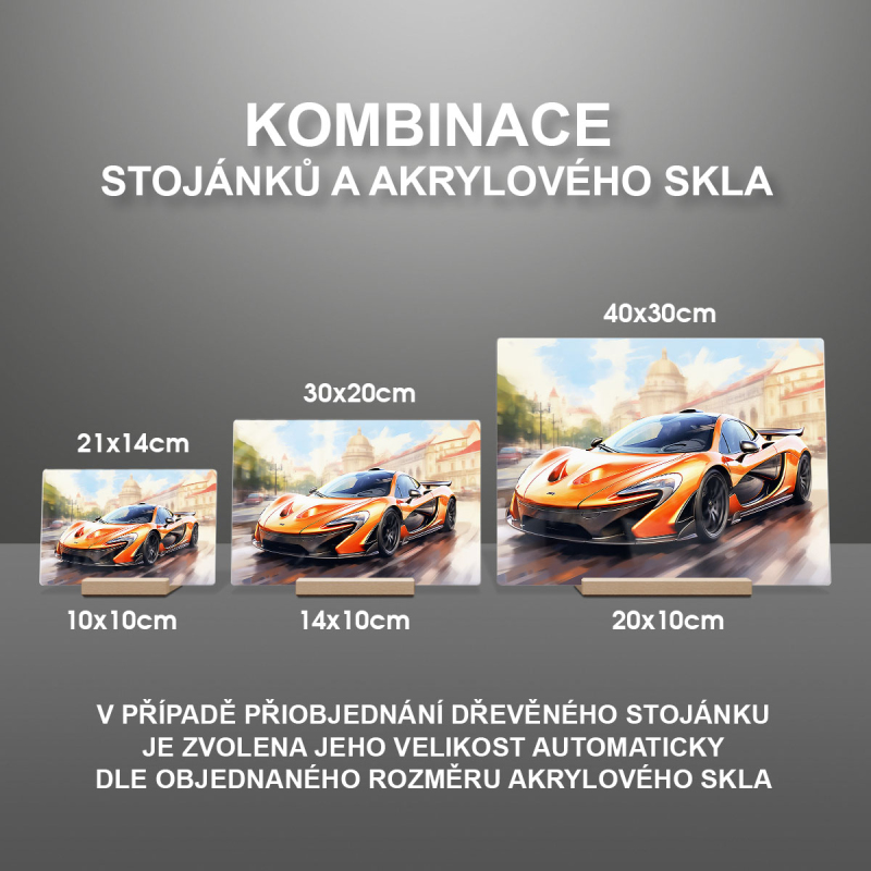 Na produktovém fotu vyobrazena nejoblíbenější varianta akrylového skla 14x21/21x14cm a dřevěný stojánek 10x10cm.