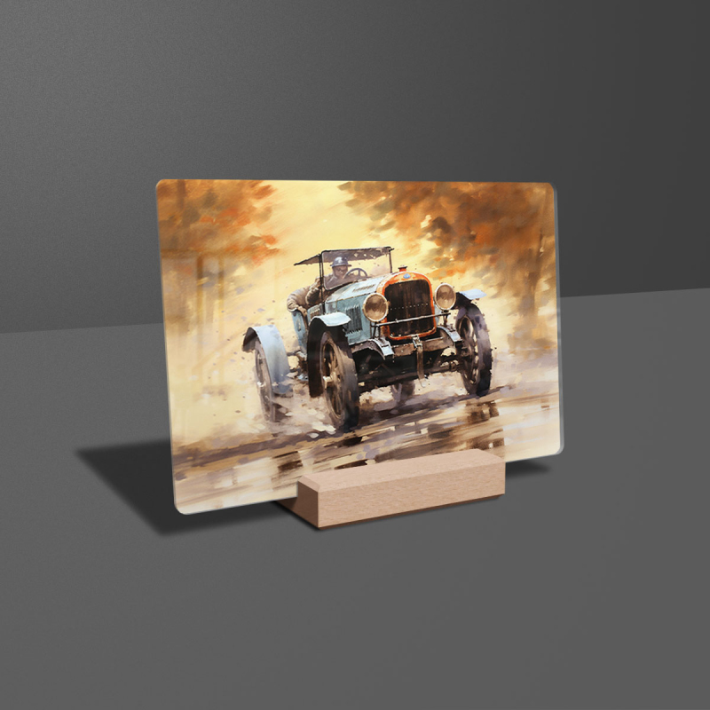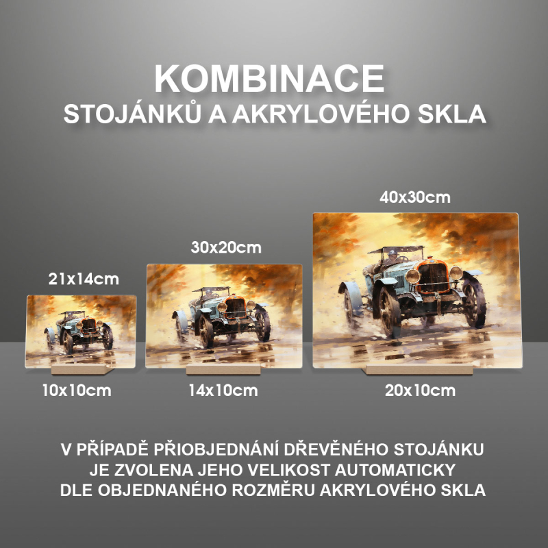Na produktovém fotu vyobrazena nejoblíbenější varianta akrylového skla 14x21/21x14cm a dřevěný stojánek 10x10cm.