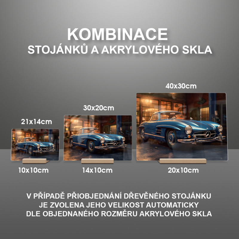 Na produktovém fotu vyobrazena nejoblíbenější varianta akrylového skla 14x21/21x14cm a dřevěný stojánek 10x10cm.