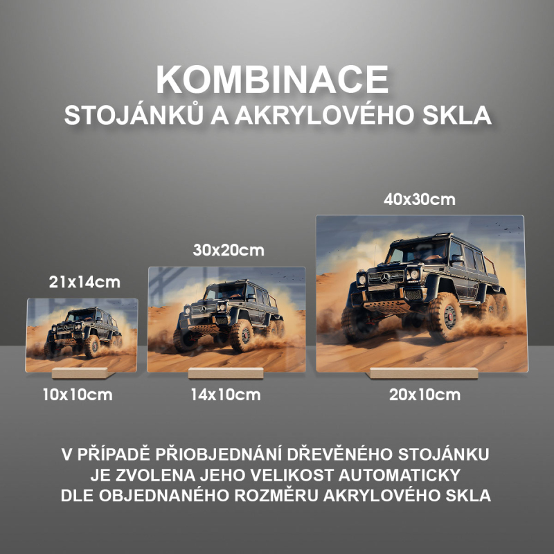 V případě přiobjednání dřevěného stojánku je zvolena jeho velikost automaticky dle objednaného rozměru akrylového skla viz produktové foto.