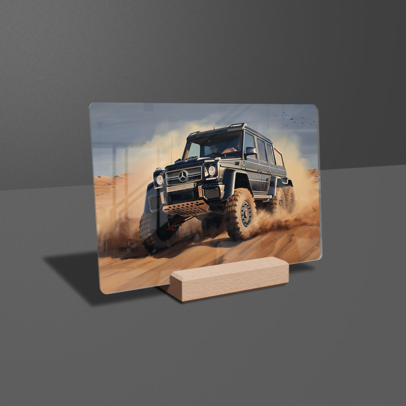 Na produktovém fotu vyobrazena nejoblíbenější varianta akrylového skla 14x21/21x14cm a dřevěný stojánek 10x10cm.