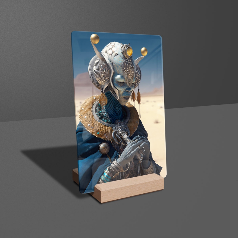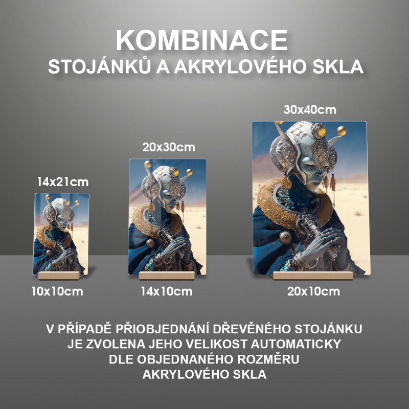 Na produktovém fotu vyobrazena nejoblíbenější varianta akrylového skla 14x21/21x14cm a dřevěný stojánek 10x10cm.
