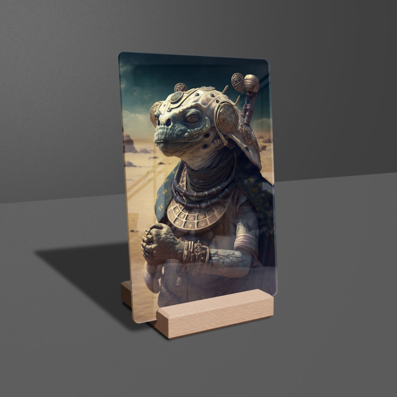 Na produktovém fotu vyobrazena nejoblíbenější varianta akrylového skla 14x21/21x14cm a dřevěný stojánek 10x10cm.