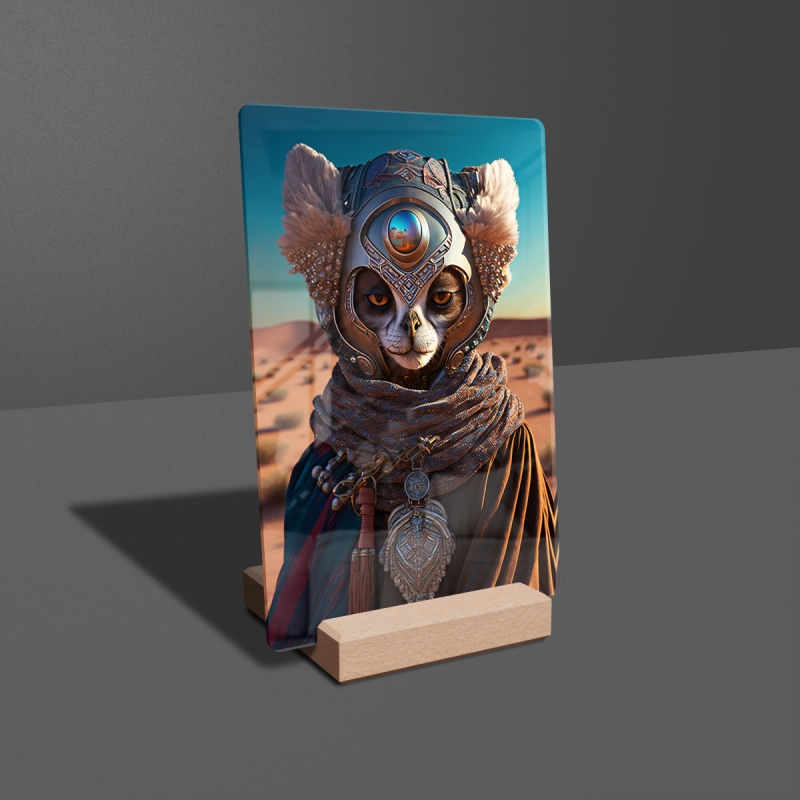 Na produktovém fotu vyobrazena nejoblíbenější varianta akrylového skla 14x21/21x14cm a dřevěný stojánek 10x10cm.