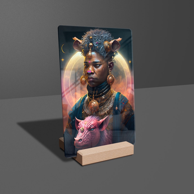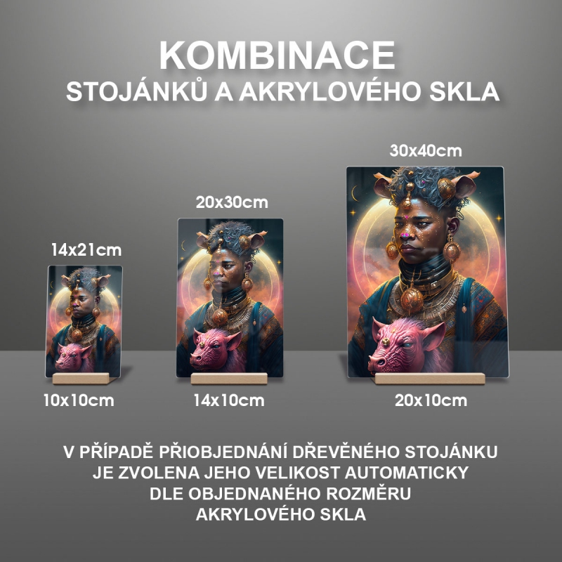 Na produktovém fotu vyobrazena nejoblíbenější varianta akrylového skla 14x21/21x14cm a dřevěný stojánek 10x10cm.