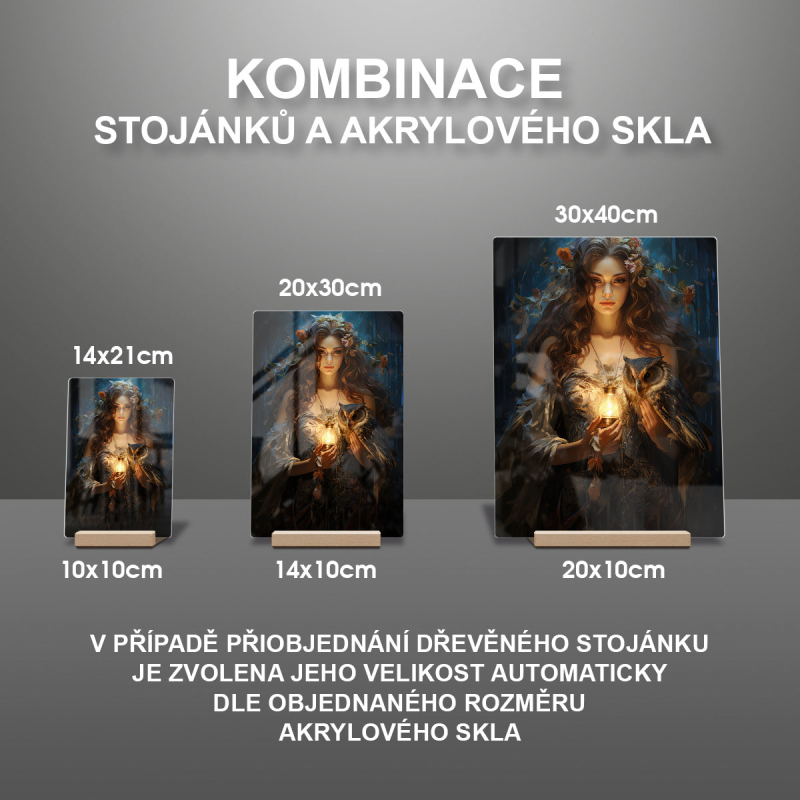 Na produktovém fotu vyobrazena nejoblíbenější varianta akrylového skla 14x21/21x14cm a dřevěný stojánek 10x10cm.