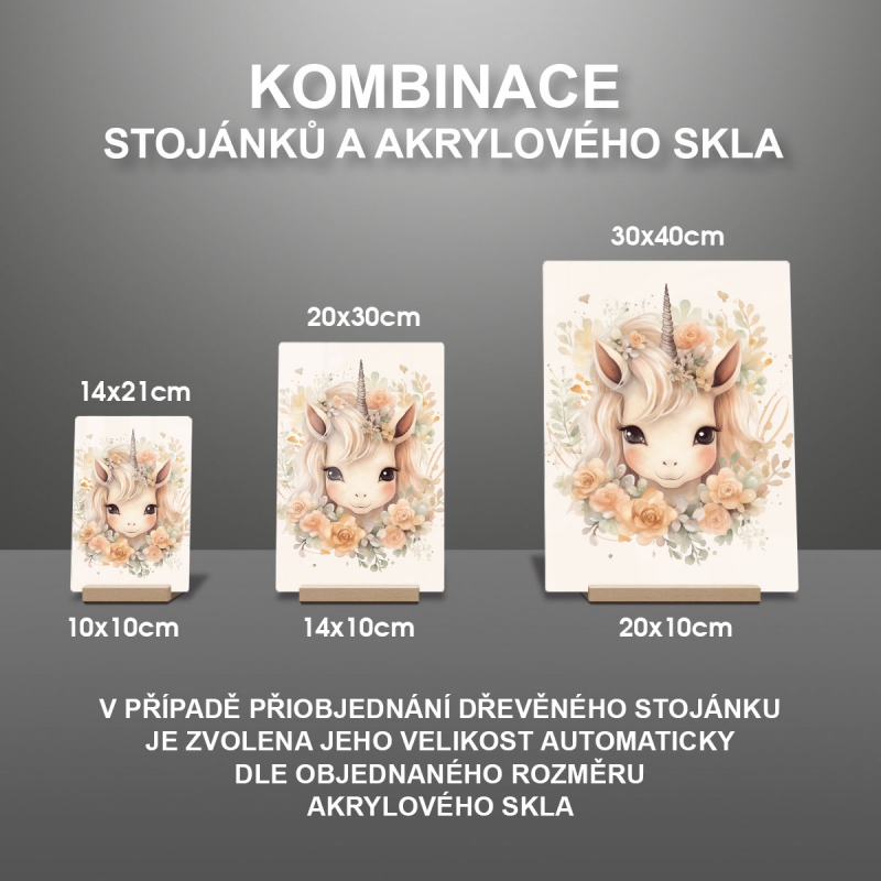 Na produktovém fotu vyobrazena nejoblíbenější varianta akrylového skla 14x21/21x14cm a dřevěný stojánek 10x10cm.