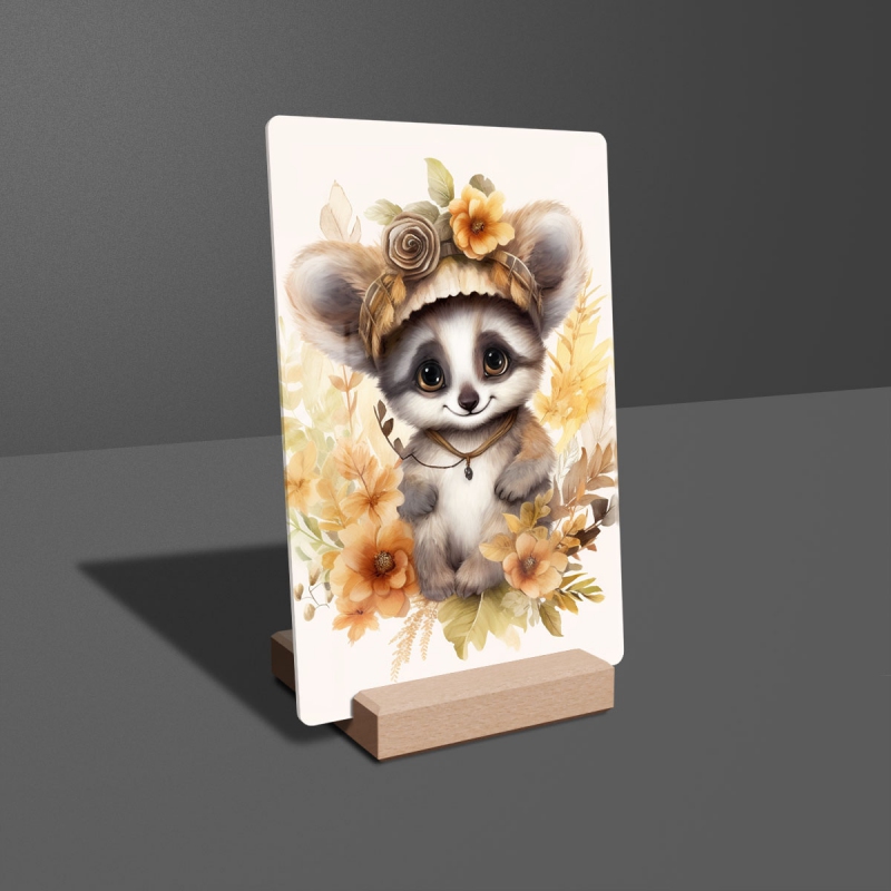 Na produktovém fotu vyobrazena nejoblíbenější varianta akrylového skla 14x21/21x14cm a dřevěný stojánek 10x10cm.