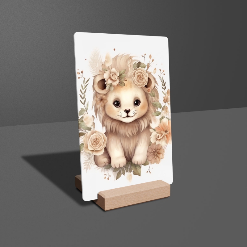 Na produktovém fotu vyobrazena nejoblíbenější varianta akrylového skla 14x21/21x14cm a dřevěný stojánek 10x10cm.