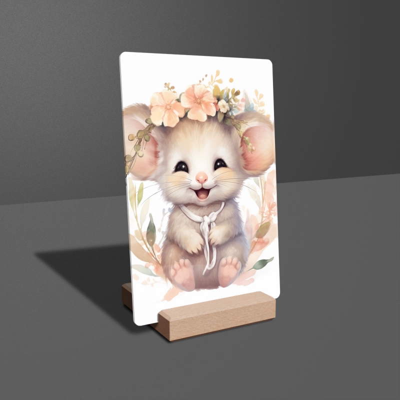 Na produktovém fotu vyobrazena nejoblíbenější varianta akrylového skla 14x21/21x14cm a dřevěný stojánek 10x10cm.