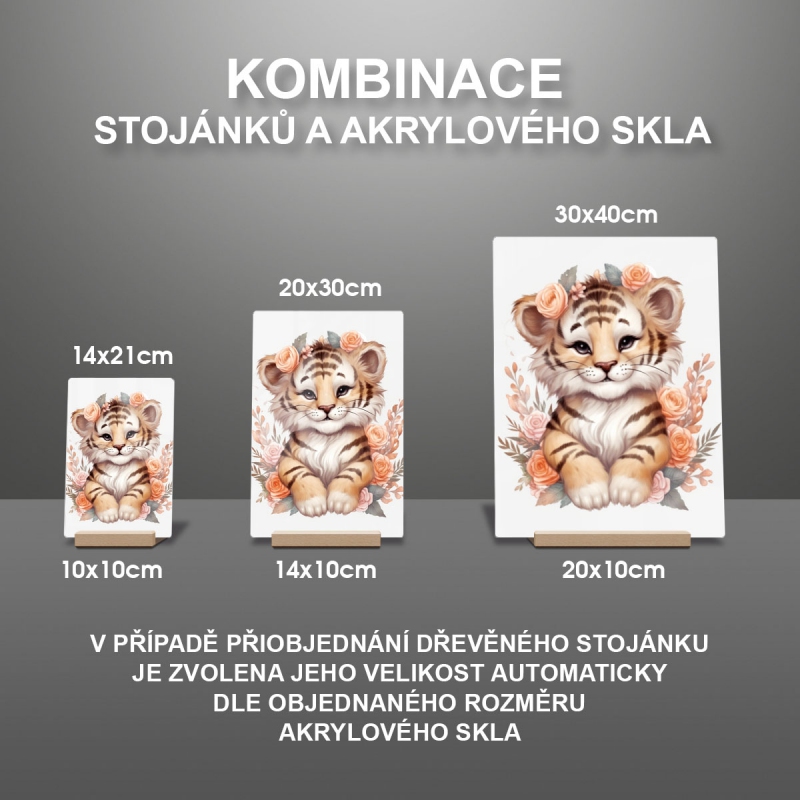 Na produktovém fotu vyobrazena nejoblíbenější varianta akrylového skla 14x21/21x14cm a dřevěný stojánek 10x10cm.