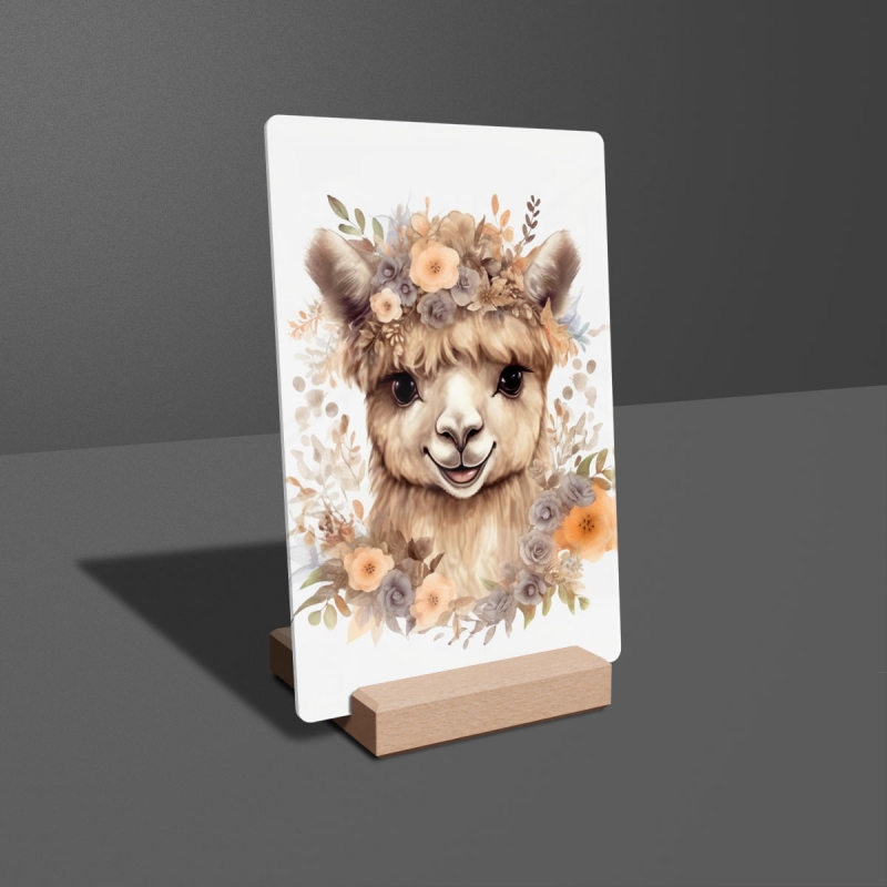 Na produktovém fotu vyobrazena nejoblíbenější varianta akrylového skla 14x21/21x14cm a dřevěný stojánek 10x10cm.