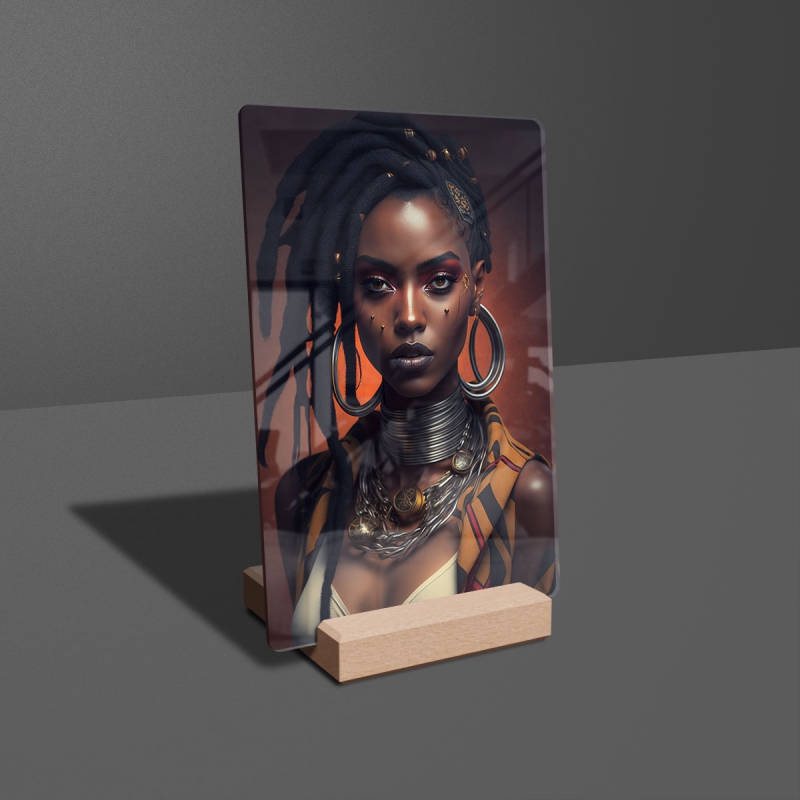 Na produktovém fotu vyobrazena nejoblíbenější varianta akrylového skla 14x21/21x14cm a dřevěný stojánek 10x10cm.