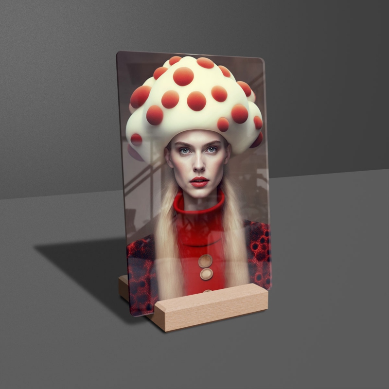 Na produktovém fotu vyobrazena nejoblíbenější varianta akrylového skla 14x21/21x14cm a dřevěný stojánek 10x10cm.