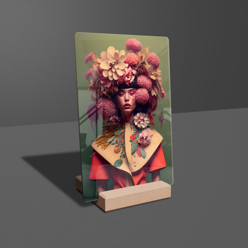 Na produktovém fotu vyobrazena nejoblíbenější varianta akrylového skla 14x21/21x14cm a dřevěný stojánek 10x10cm.