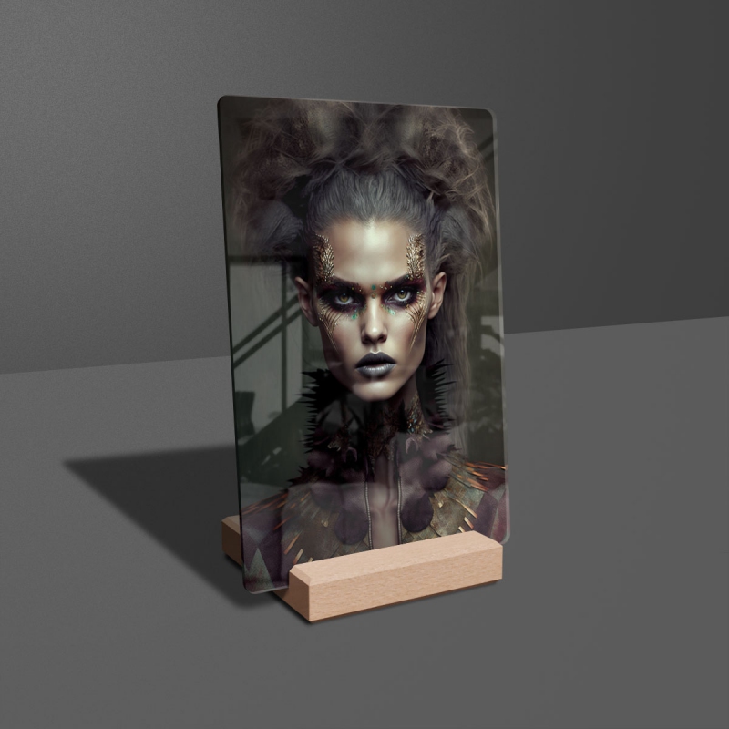 Na produktovém fotu vyobrazena nejoblíbenější varianta akrylového skla 14x21/21x14cm a dřevěný stojánek 10x10cm.