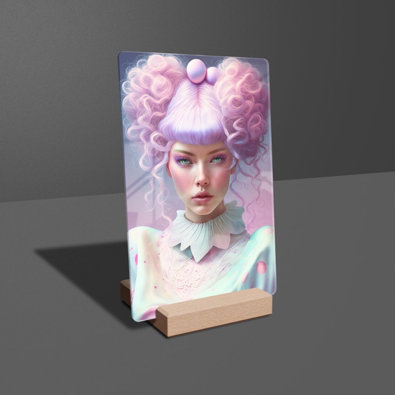 Na produktovém fotu vyobrazena nejoblíbenější varianta akrylového skla 14x21/21x14cm a dřevěný stojánek 10x10cm.