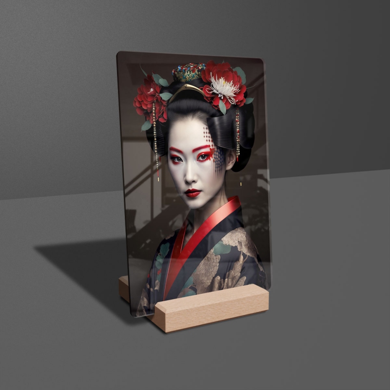 Na produktovém fotu vyobrazena nejoblíbenější varianta akrylového skla 14x21/21x14cm a dřevěný stojánek 10x10cm.