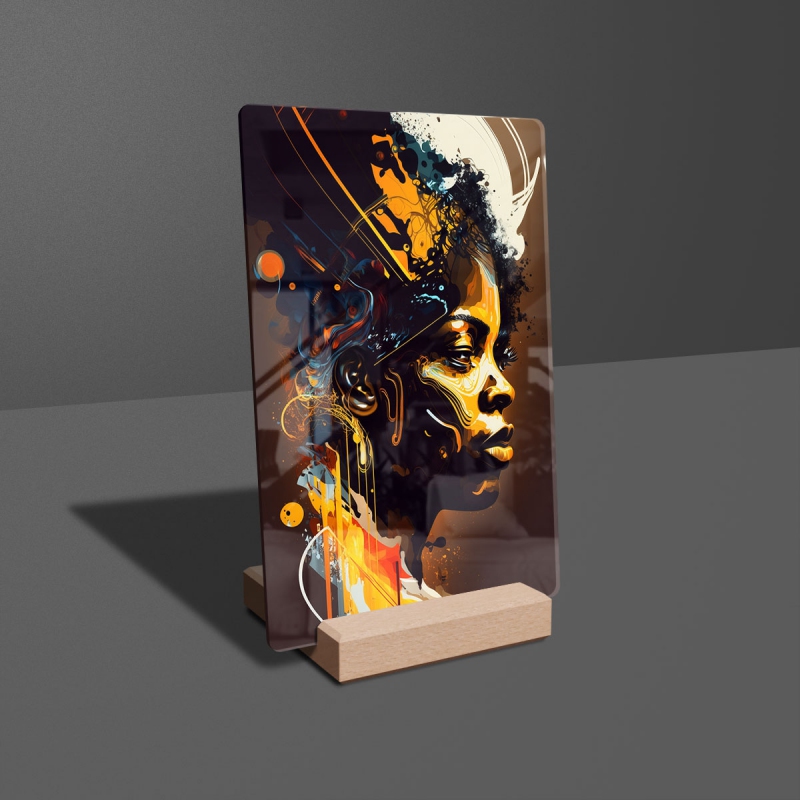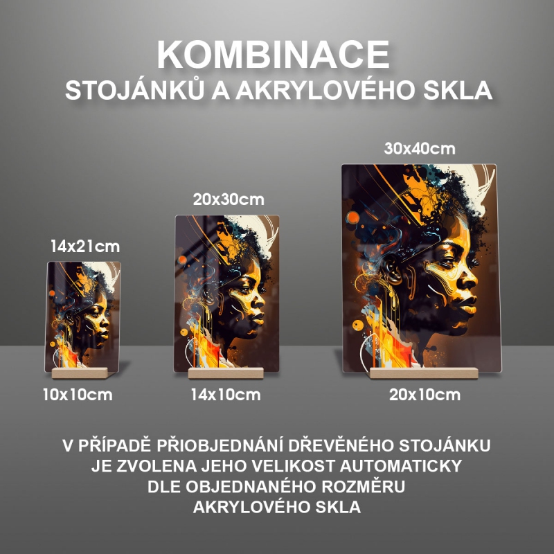 Na produktovém fotu vyobrazena nejoblíbenější varianta akrylového skla 14x21/21x14cm a dřevěný stojánek 10x10cm.