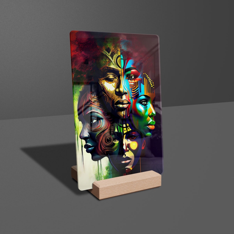 Na produktovém fotu vyobrazena nejoblíbenější varianta akrylového skla 14x21/21x14cm a dřevěný stojánek 10x10cm.