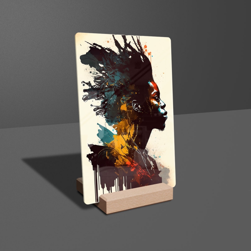 Na produktovém fotu vyobrazena nejoblíbenější varianta akrylového skla 14x21/21x14cm a dřevěný stojánek 10x10cm.