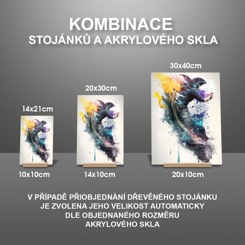 Na produktovém fotu vyobrazena nejoblíbenější varianta akrylového skla 14x21/21x14cm a dřevěný stojánek 10x10cm.