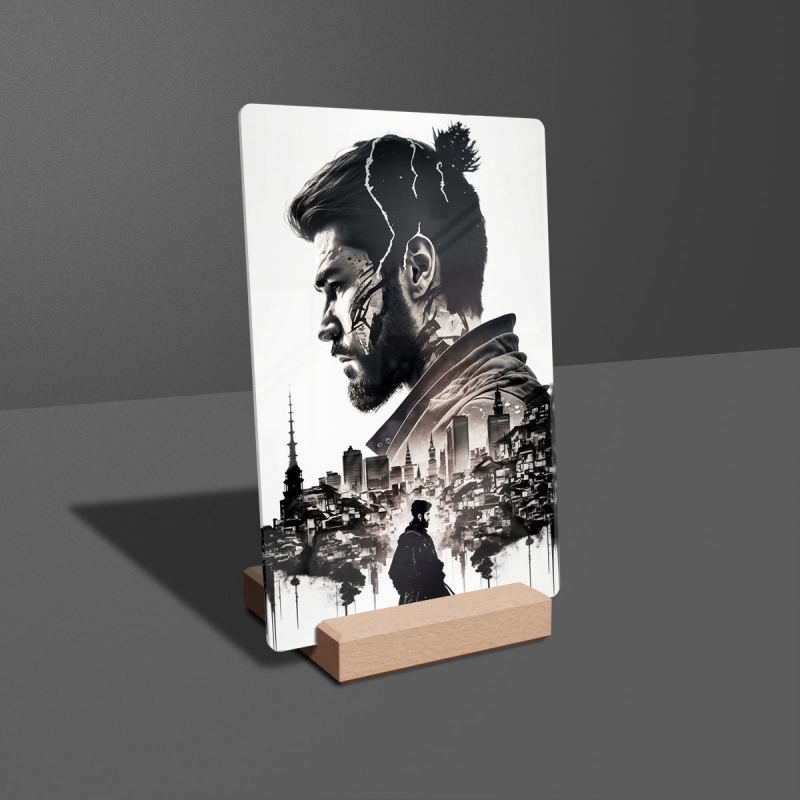 Na produktovém fotu vyobrazena nejoblíbenější varianta akrylového skla 14x21/21x14cm a dřevěný stojánek 10x10cm.