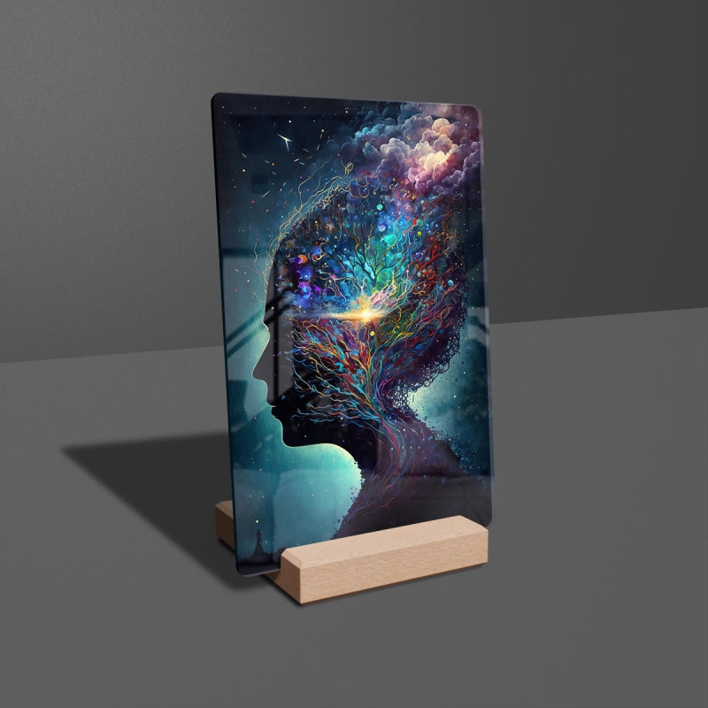 Na produktovém fotu vyobrazena nejoblíbenější varianta akrylového skla 14x21/21x14cm a dřevěný stojánek 10x10cm.