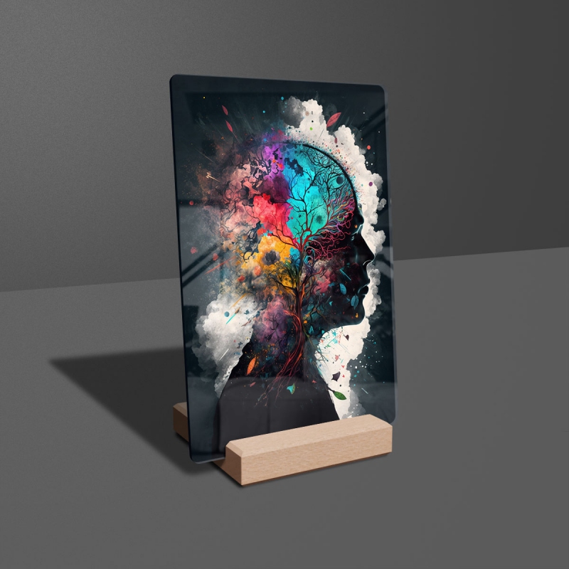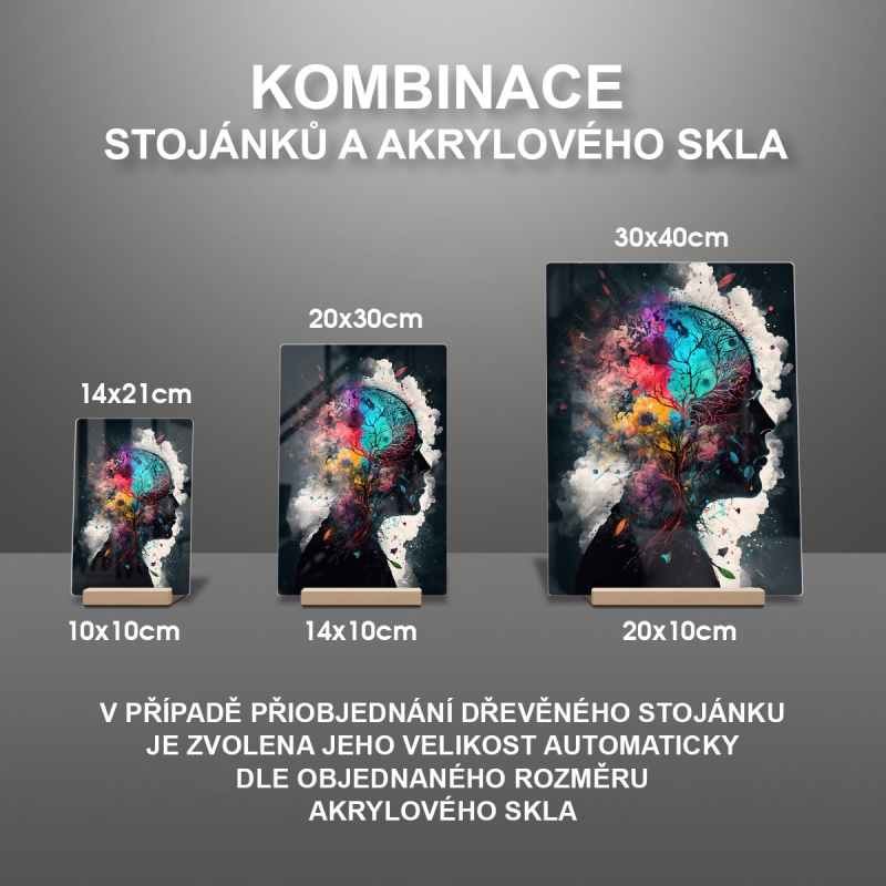 Na produktovém fotu vyobrazena nejoblíbenější varianta akrylového skla 14x21/21x14cm a dřevěný stojánek 10x10cm.