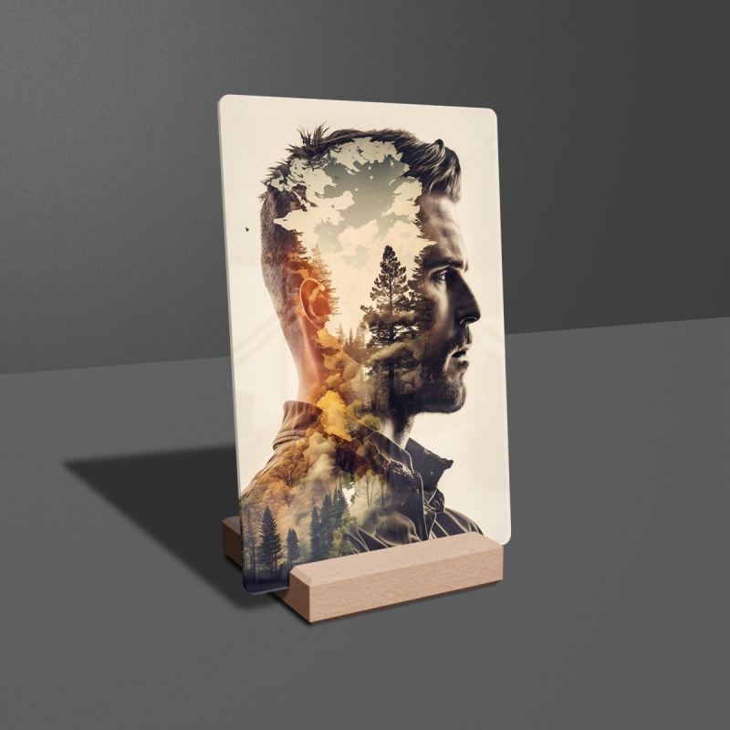 Na produktovém fotu vyobrazena nejoblíbenější varianta akrylového skla 14x21/21x14cm a dřevěný stojánek 10x10cm.