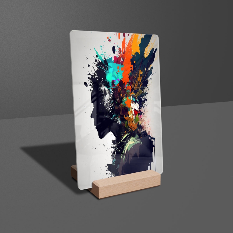 Na produktovém fotu vyobrazena nejoblíbenější varianta akrylového skla 14x21/21x14cm a dřevěný stojánek 10x10cm.