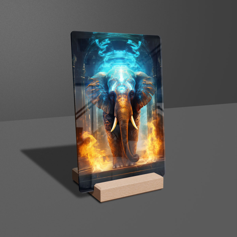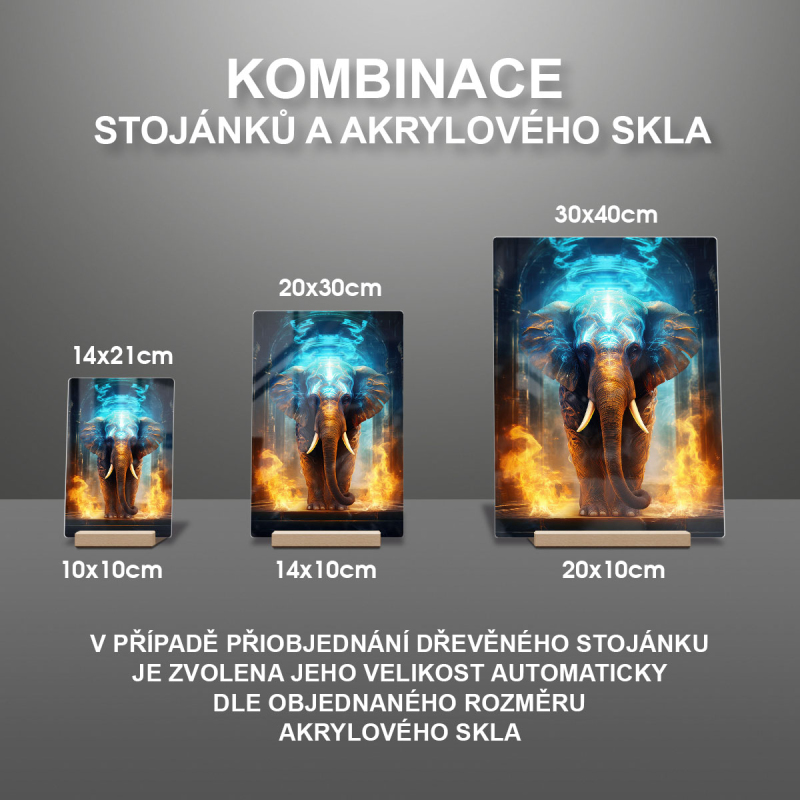 Na produktovém fotu vyobrazena nejoblíbenější varianta akrylového skla 14x21/21x14cm a dřevěný stojánek 10x10cm.