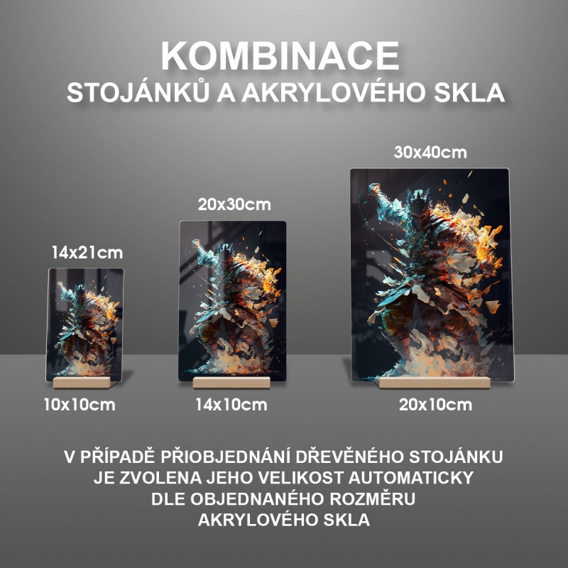 Na produktovém fotu vyobrazena nejoblíbenější varianta akrylového skla 14x21/21x14cm a dřevěný stojánek 10x10cm.