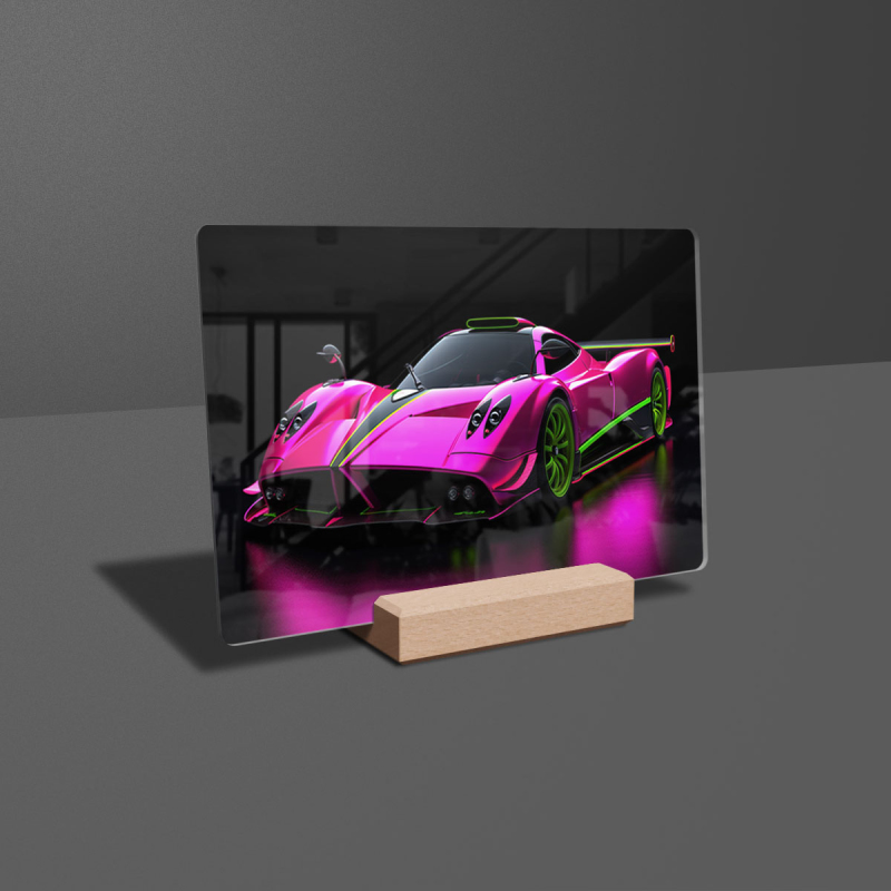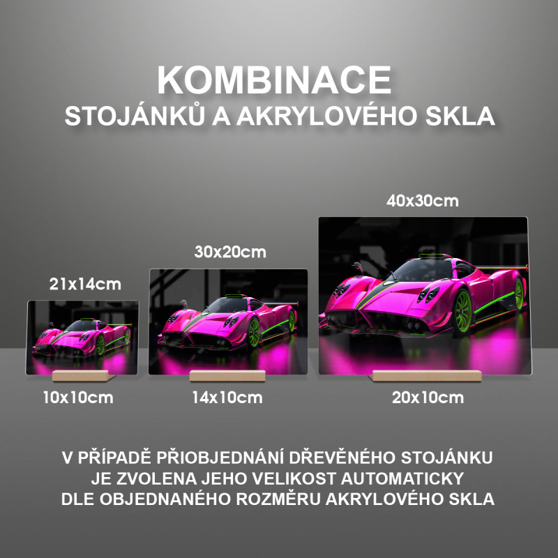 Na produktovém fotu vyobrazena nejoblíbenější varianta akrylového skla 14x21/21x14cm a dřevěný stojánek 10x10cm.