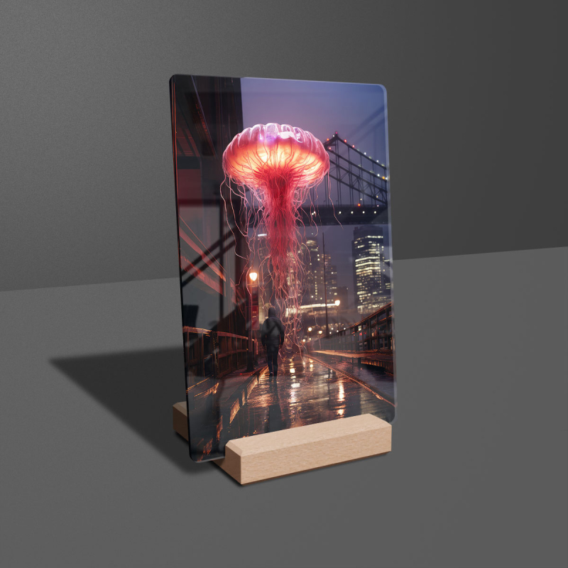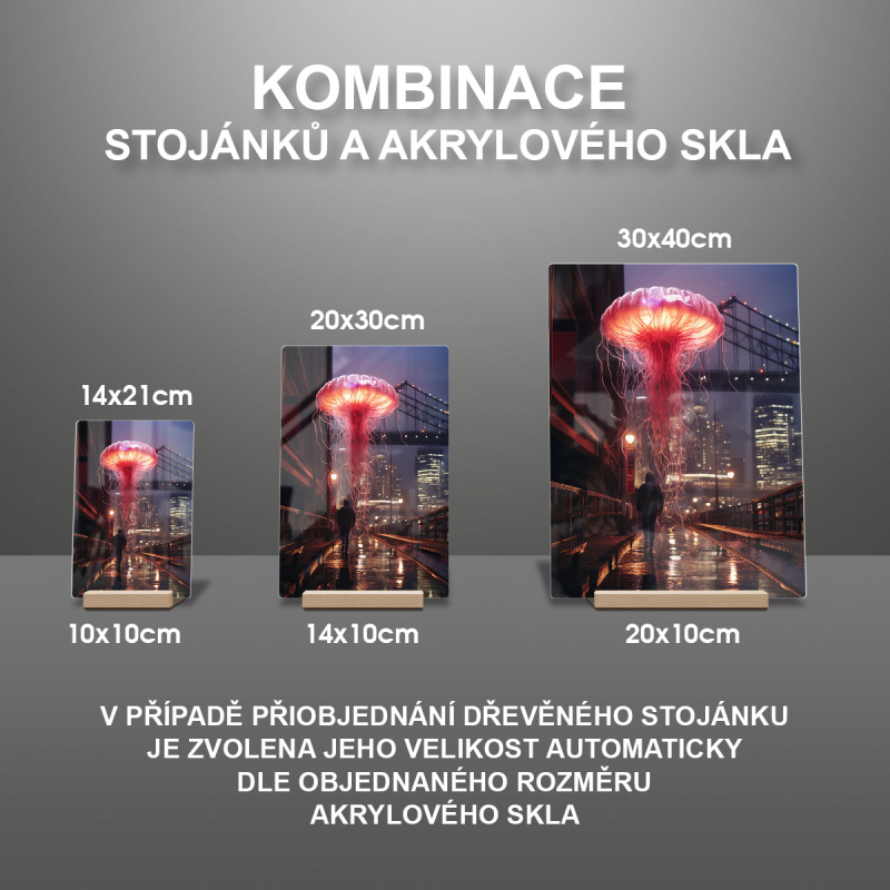 Na produktovém fotu vyobrazena nejoblíbenější varianta akrylového skla 14x21/21x14cm a dřevěný stojánek 10x10cm.