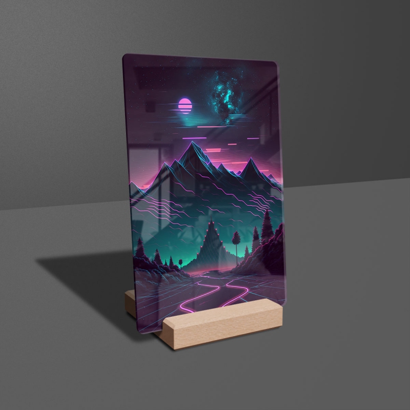Na produktovém fotu vyobrazena nejoblíbenější varianta akrylového skla 14x21/21x14cm a dřevěný stojánek 10x10cm.