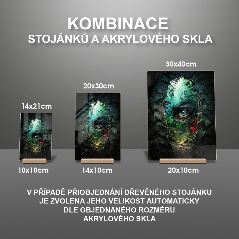 Na produktovém fotu vyobrazena nejoblíbenější varianta akrylového skla 14x21/21x14cm a dřevěný stojánek 10x10cm.
