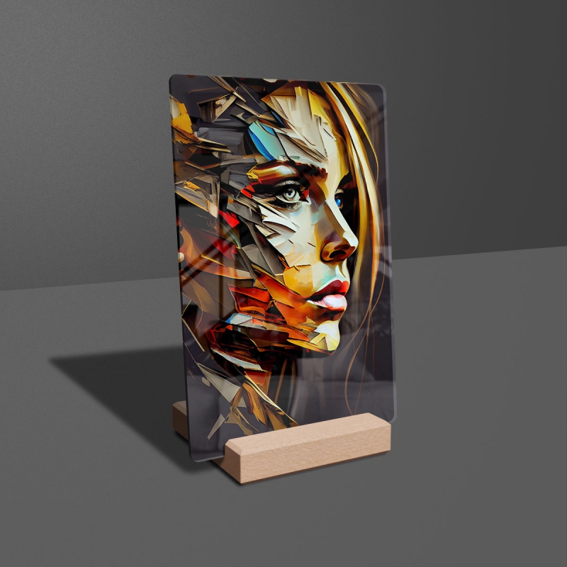 Na produktovém fotu vyobrazena nejoblíbenější varianta akrylového skla 14x21/21x14cm a dřevěný stojánek 10x10cm.