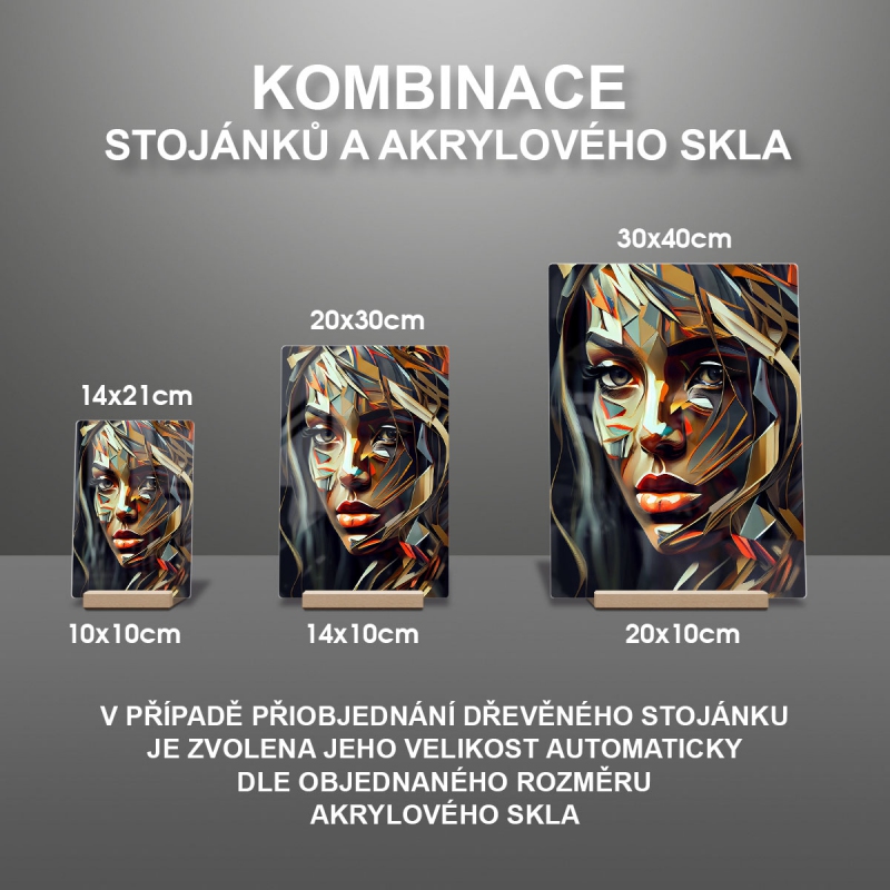 Na produktovém fotu vyobrazena nejoblíbenější varianta akrylového skla 14x21/21x14cm a dřevěný stojánek 10x10cm.