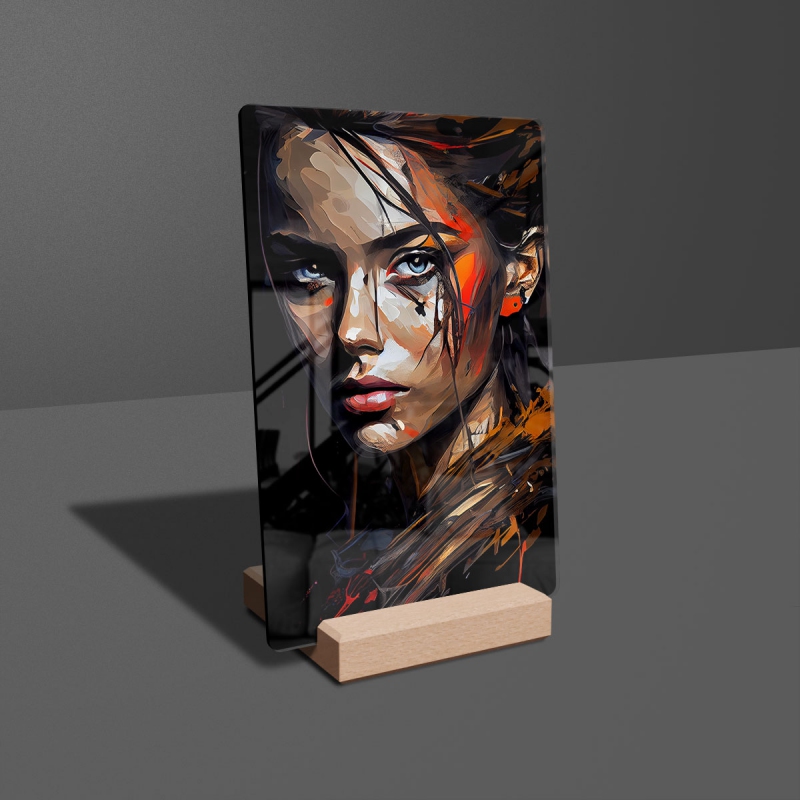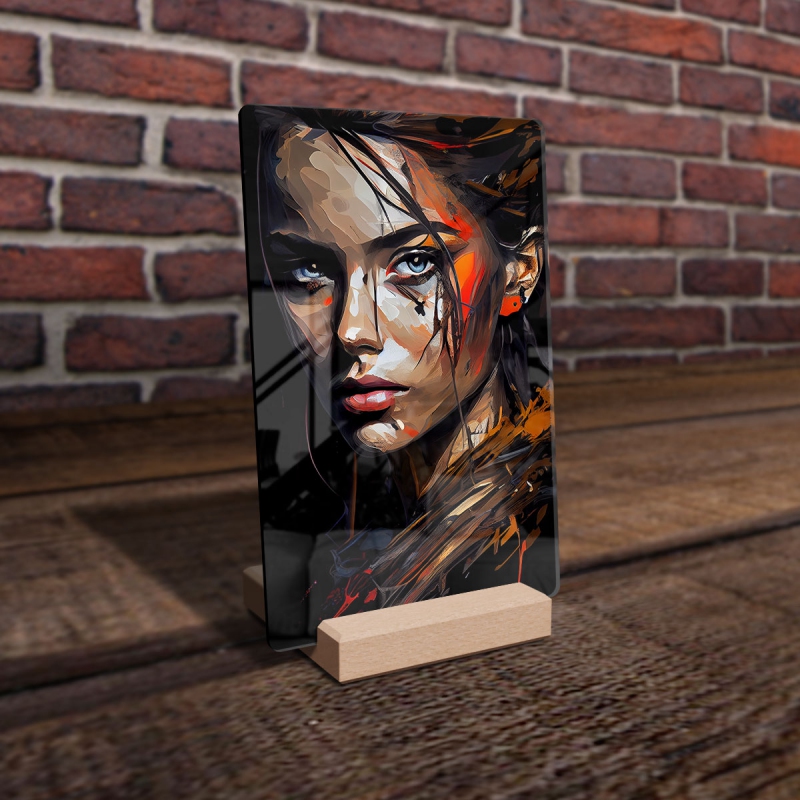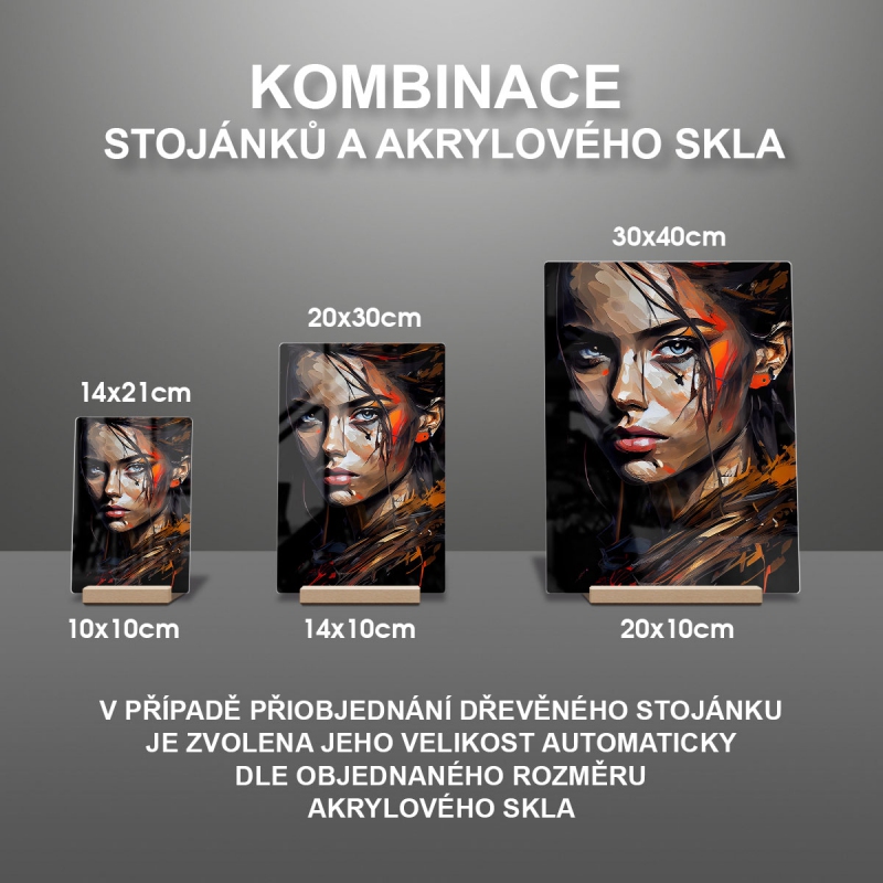 Na produktovém fotu vyobrazena nejoblíbenější varianta akrylového skla 14x21/21x14cm a dřevěný stojánek 10x10cm.