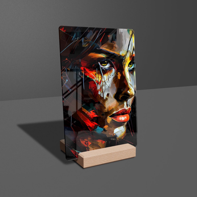 Na produktovém fotu vyobrazena nejoblíbenější varianta akrylového skla 14x21/21x14cm a dřevěný stojánek 10x10cm.