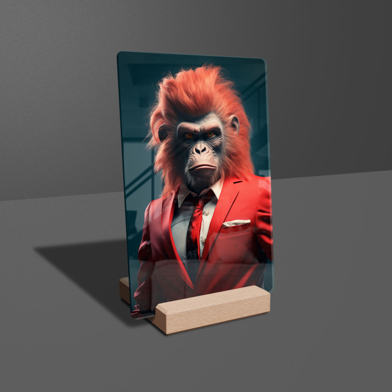 Na produktovém fotu vyobrazena nejoblíbenější varianta akrylového skla 14x21/21x14cm a dřevěný stojánek 10x10cm.