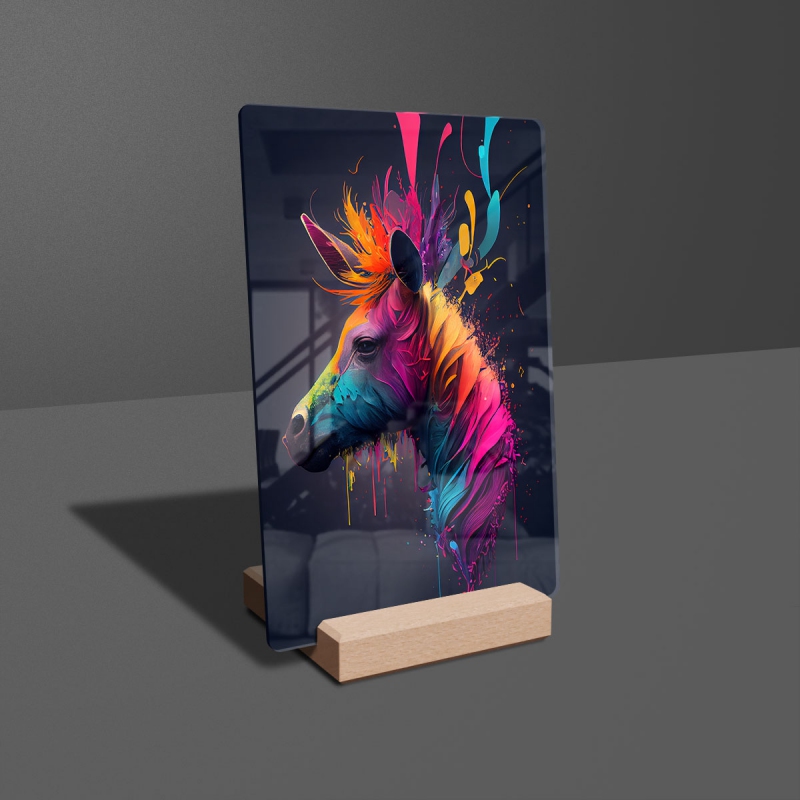 Na produktovém fotu vyobrazena nejoblíbenější varianta akrylového skla 14x21/21x14cm a dřevěný stojánek 10x10cm.